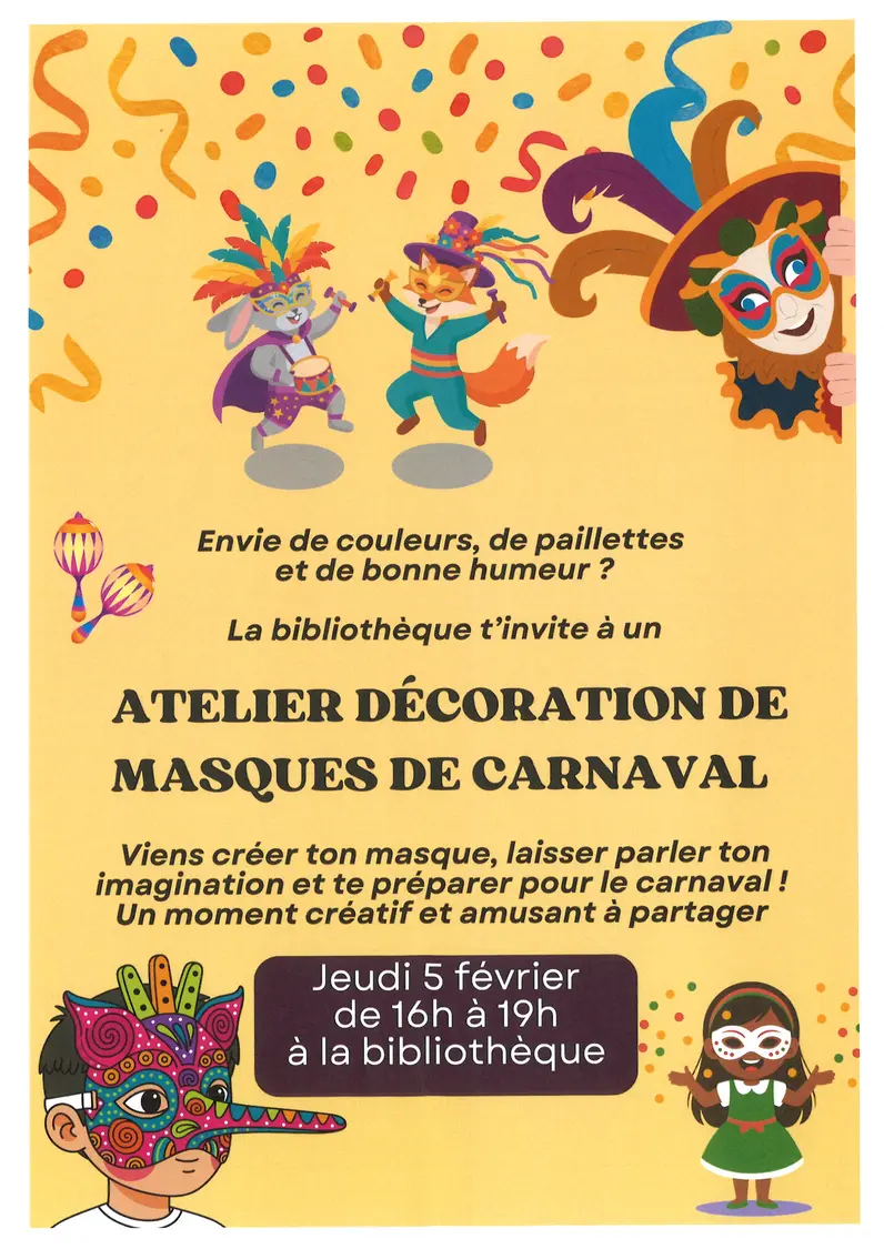 Viens créer ton masque, laisser parler ton imagination et te préparer pour le carnaval !