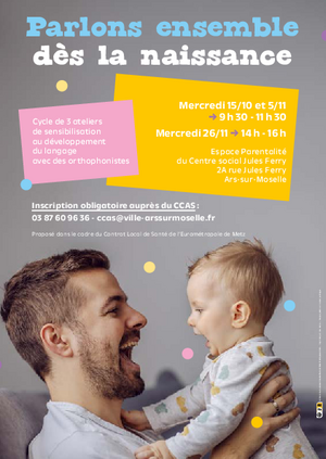 Dans le cadre de ses missions parentalité, le Centre communal d’action sociale (CCAS) d’Ars-sur-Moselle, en partenariat avec l’Eurométropole de Metz et le Syndicat départemental des orthophonistes de Moselle, organise un cycle de trois ateliers gratuits de sensibilisation au développement du langage, animés par des orthophonistes agréés.