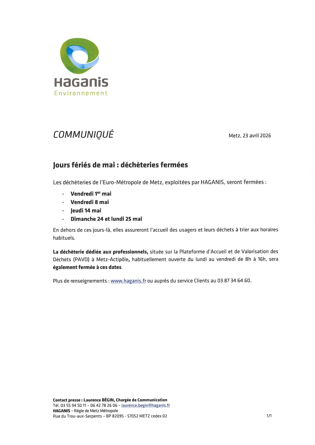 DÈCHÉTERIE fermée jours fériés de mai