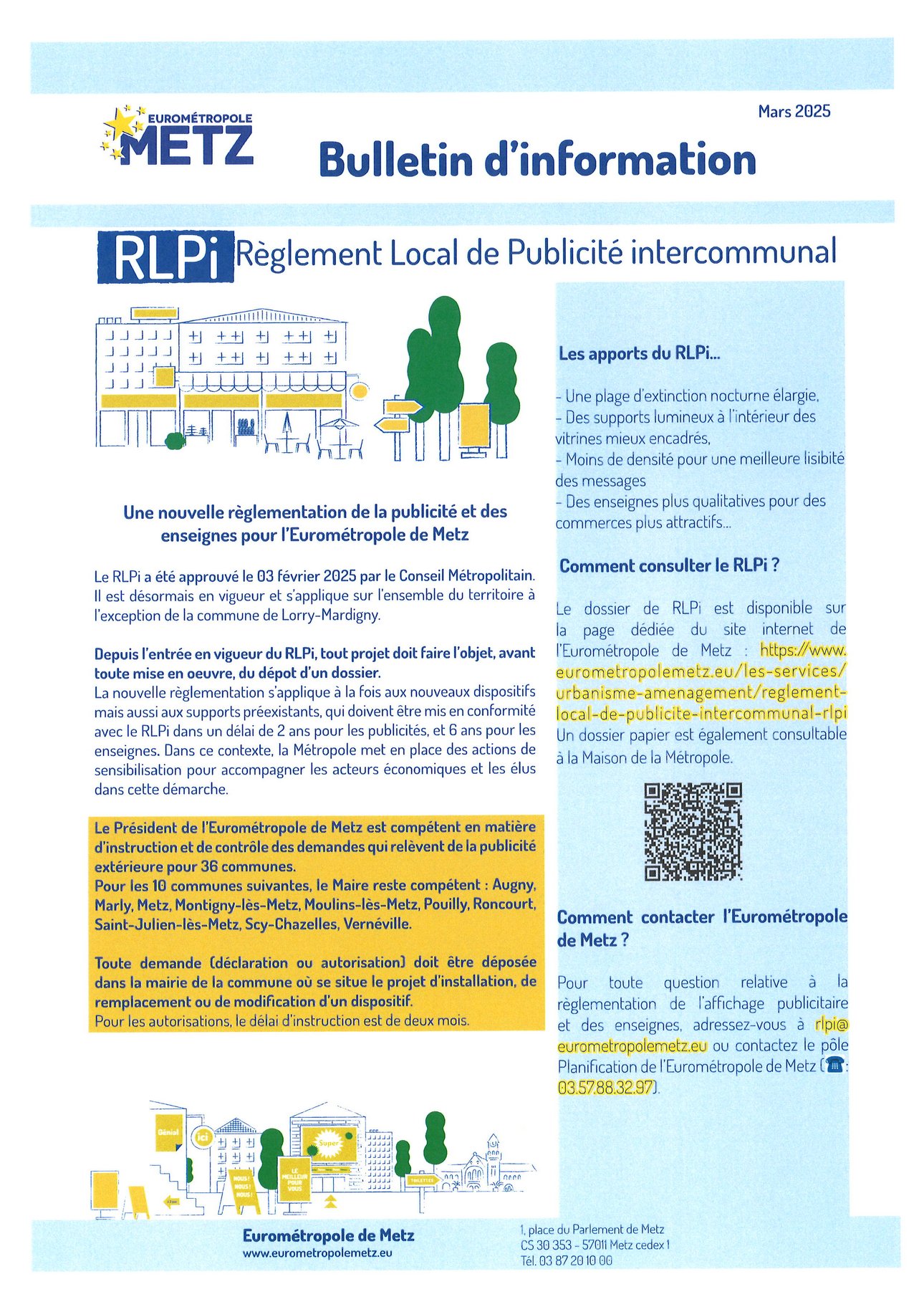 Pour toute question relative à la règlementation de l’affichage publicitaire et des enseignes, adressez-vous à rlpieurometropolemetzeu ou contactez le pôle Planification de l’Eurométropole de Metz (03.57.88.32.97)